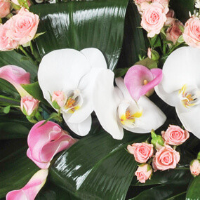 Détail de la raquette de fleurs de deuil L'Angelus : roses blanches, genêt blanc, orchidées phalaenopsis blanches, minis oeillets rose (ou petites roses rose), branches d'aralia et autres verdures. Fleurs variables selon les saisons et la disponibilité en magasin tout en gardant l'esprit la forme et les couleurs. (Réf. Florale 9221, L'Angélus.) - Visuel non contractuel - Visuel correspondant à la formule Meilleur Compromis.